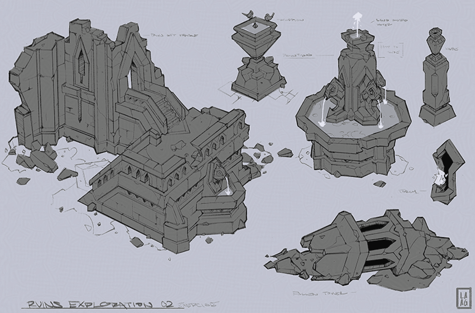 When designing architecture, props, vehicles, or anything that would populate the environment, I try to do so with the intention of adding history to the object. There are environments that are integral to the story and should have more detail and narrative infused in their design but I try to make sure not to neglect the secondary objects as well. It's their wear and tear, the selective patterns that decorate the walls, the past civilization that inhabited the location that bring environments to life and bring a certain gravitas to them. Each design choice can either build your narrative or muddy things up and take the viewer out of the immersion. Tying every aspect of the environment creates a coherent language that can help visual cohesiveness.